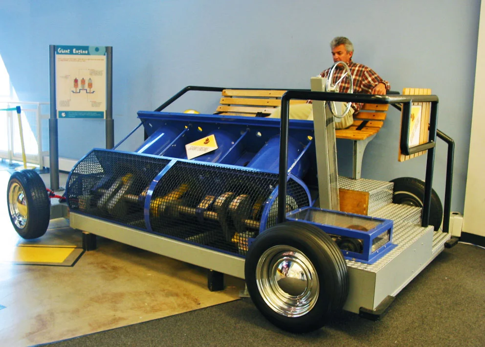 Participants push down on one of the three pistons, and the piston rotates the drive shaft. In turn, the drive wheel rotates, just like a real engine.