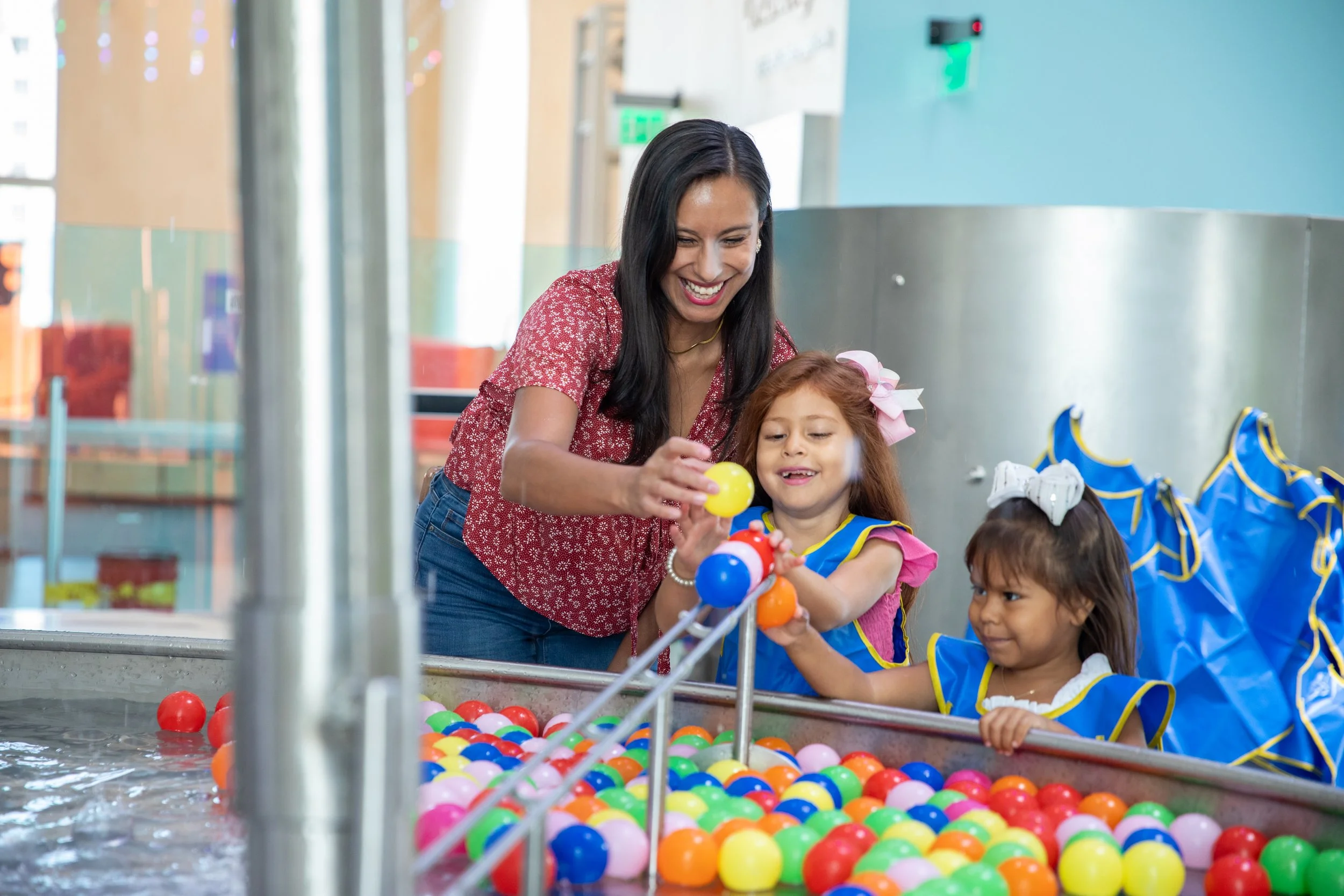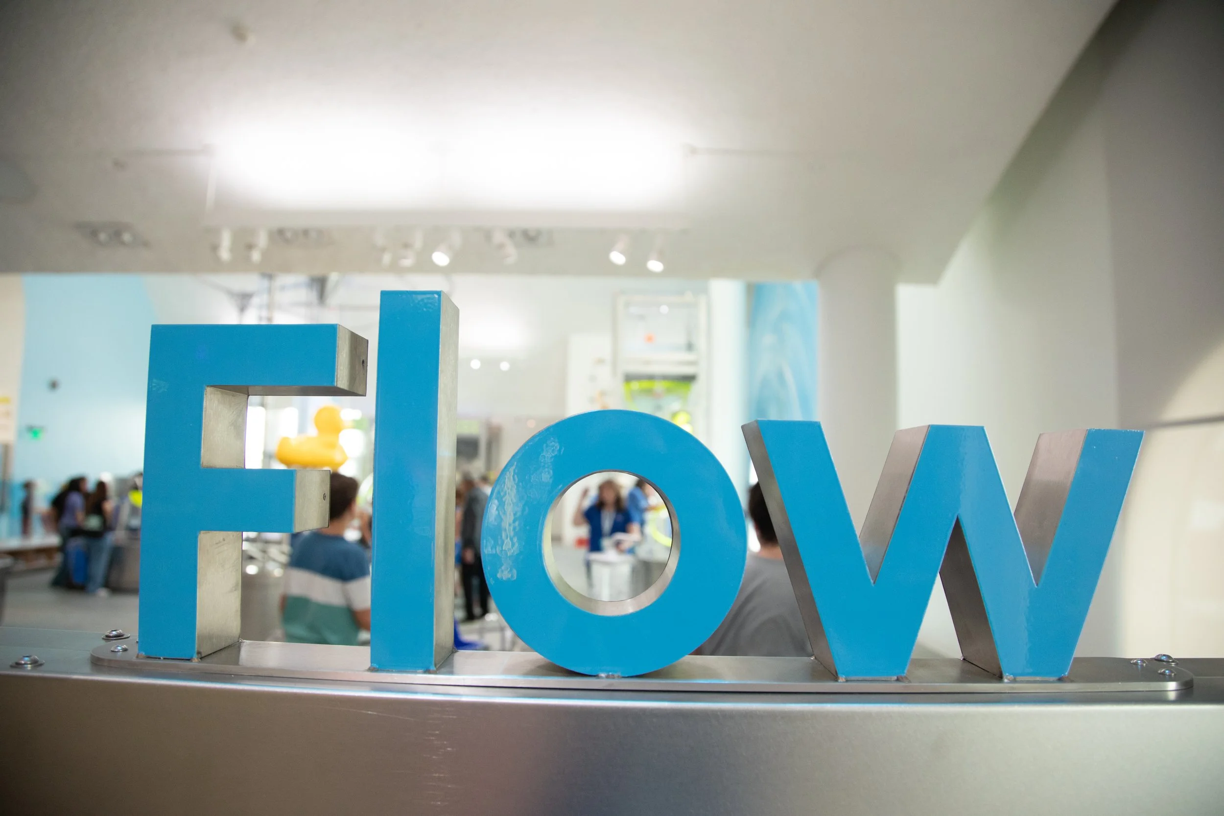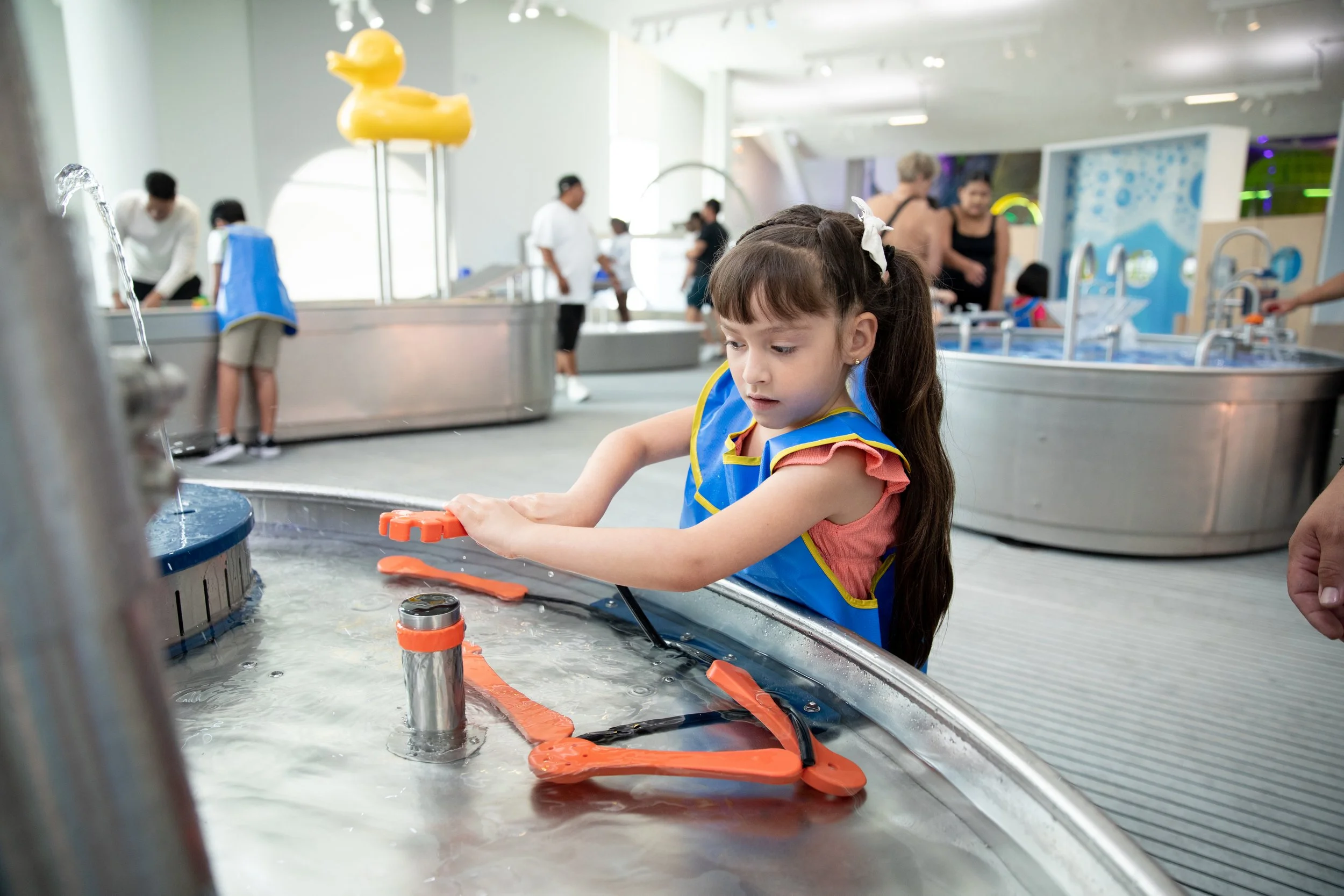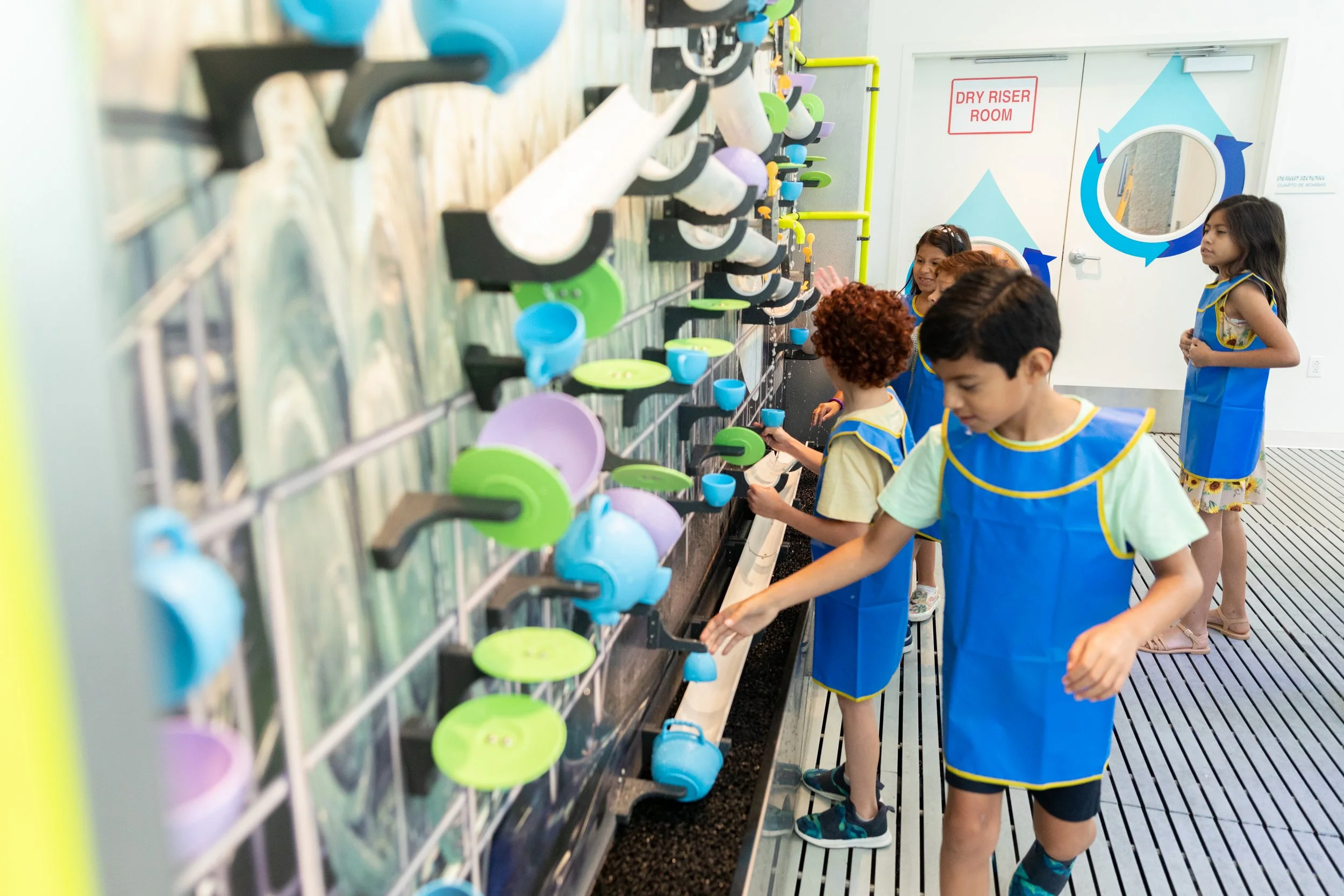The Flow Gallery immerses guests in the fascinating world of water, showcasing its uses through larger-than-life interactive exhibits like a 20-foot interactive toilet, a bus washing station, and a walk-through dishwashing experience. The water appliance theme extends throughout the space with creative design elements such as a wall of dryers and playful bubble graphics. Beyond everyday applications, guests can explore fluid dynamics firsthand, watching laminar jets launch balls through the air and witnessing the power of a 12-foot water vortex. Every element of the gallery is carefully designed to spark curiosity, invite experimentation, and create an engaging STEAM learning experience.
