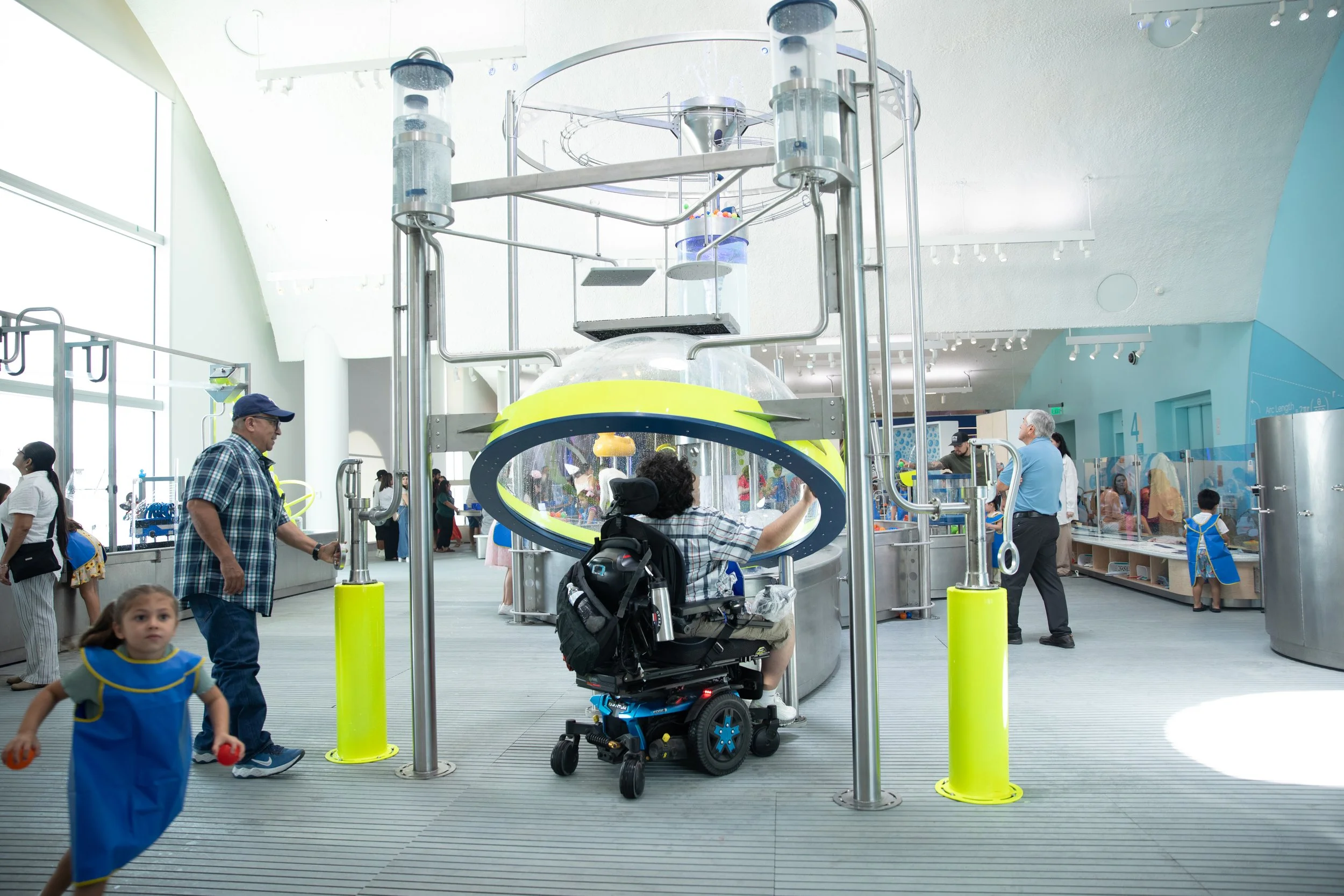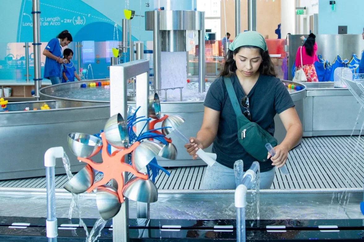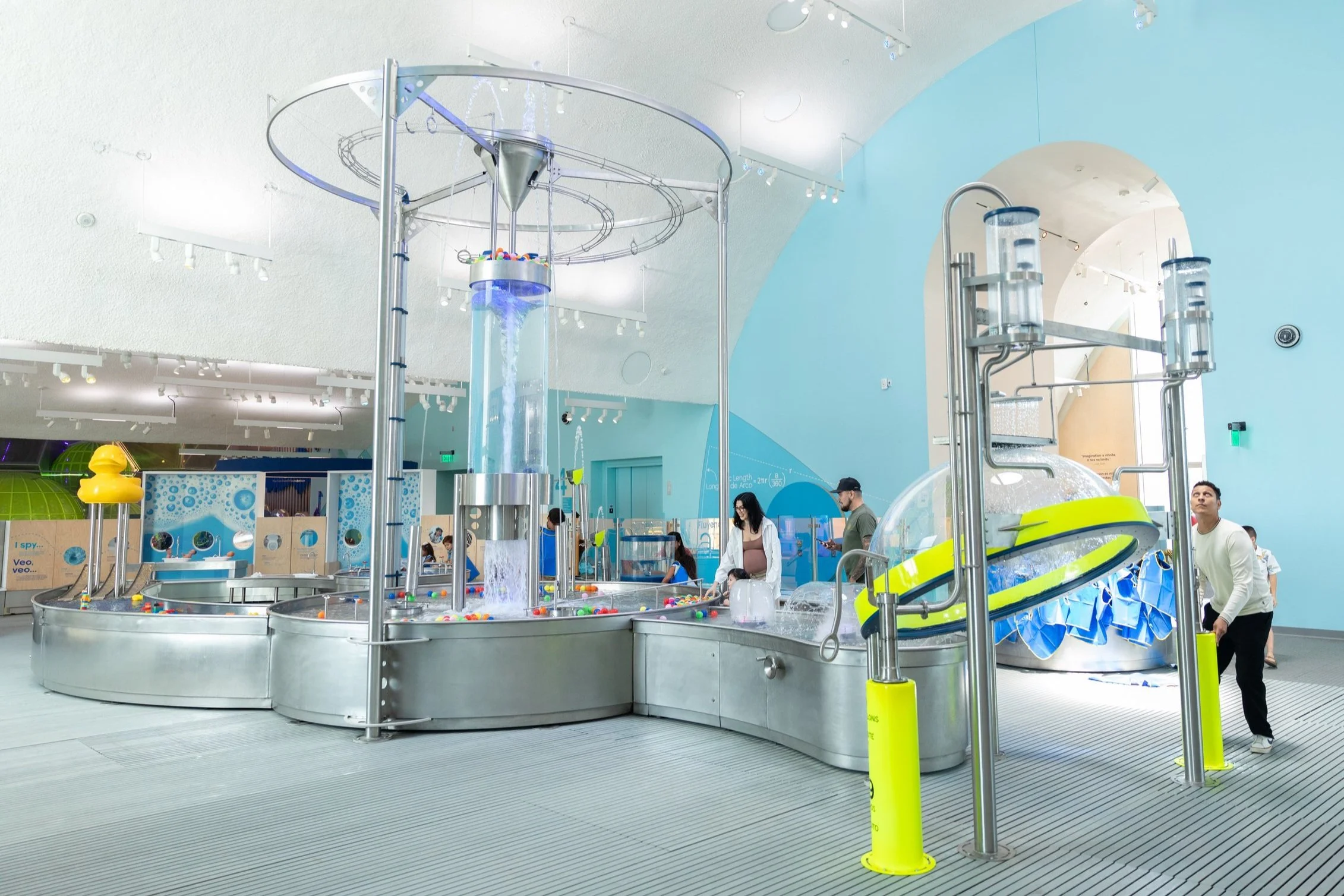 With both indoor and outdoor elements, the sheer scale of the Flow Gallery presented unique challenges, particularly in installing towering 20-foot structures on the building’s top floor. Each component was meticulously engineered for efficient transport, with some elements designed to be manually carried upstairs. Committed to the Discovery Center’s mission of accessible learning for all, the gallery features thoughtfully designed spaces to ensure inclusivity for guests of all abilities. To support the exhibit’s expansive water features, an adjacent pump and filtration room was outfitted with six commercial filtration units and an automated chemical balancing system, ensuring smooth operation and minimal maintenance.