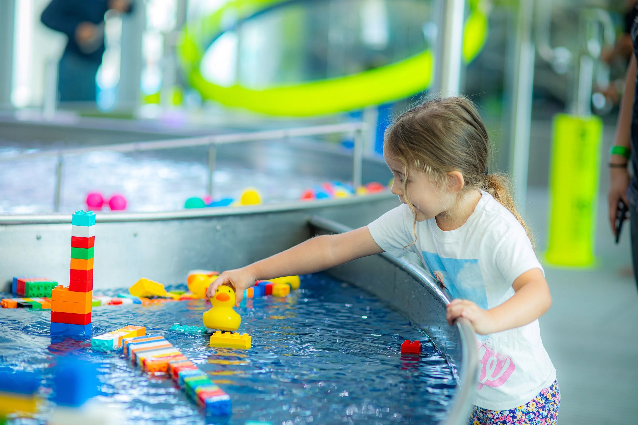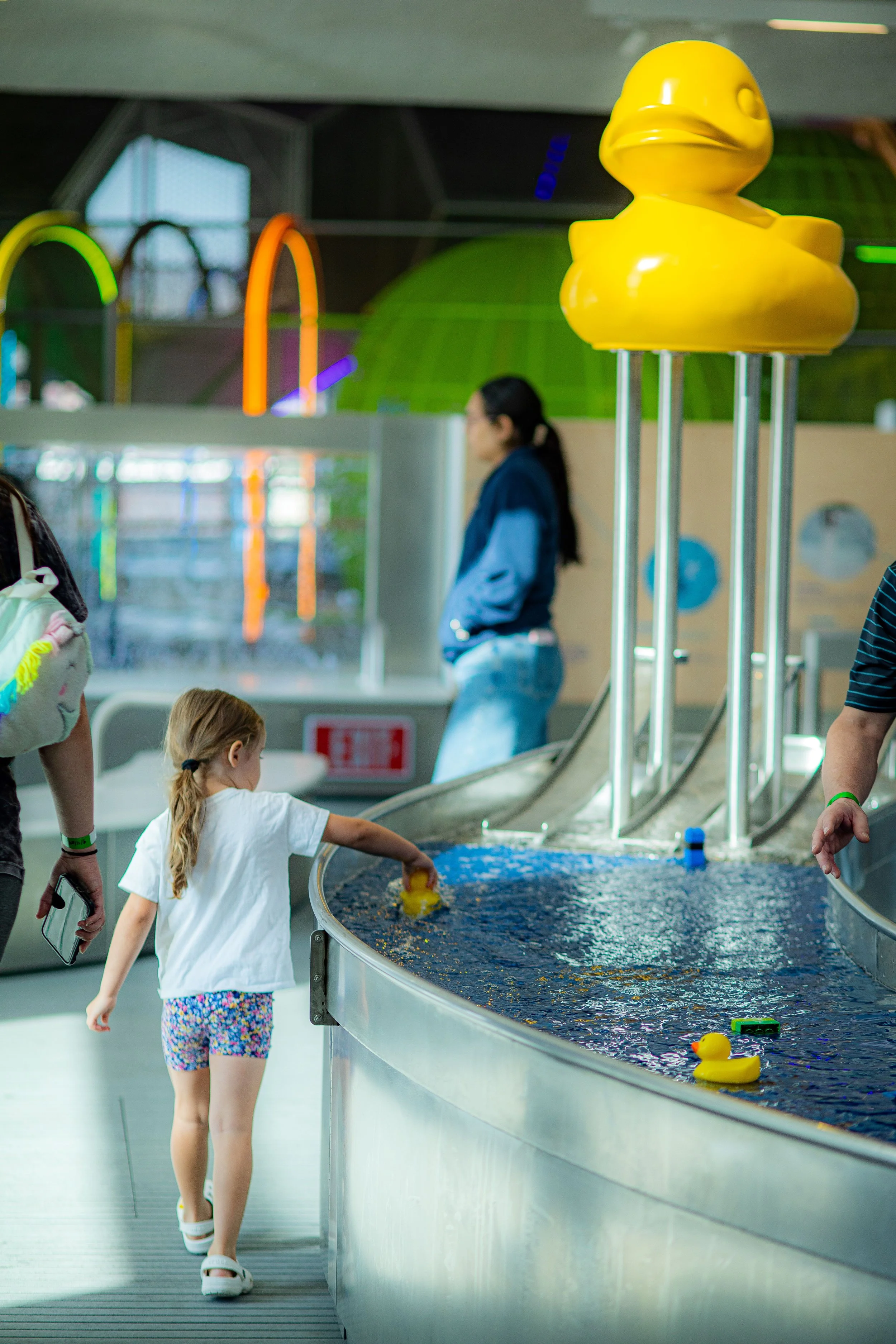 Duck race and duplo dam | The large duck sculpture serves as the starting ramp for guests to race rubber ducks through the duplo dam building area.