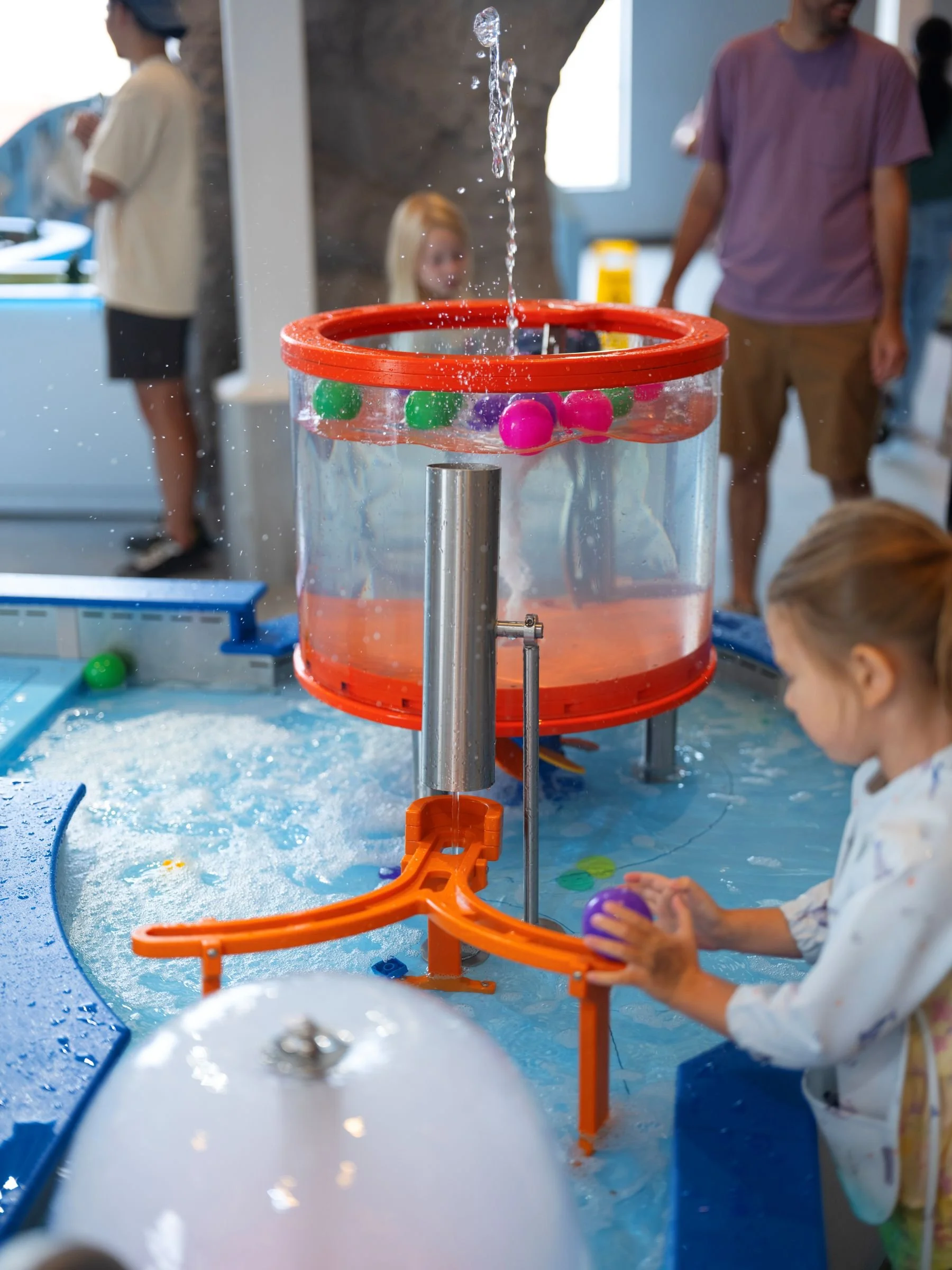 Drawing inspiration from the Thames River, the gallery’s water table captures the movement, energy, and playfulness of the local waterway. A striking twenty-foot laminar fountain launches balls high into a sculptural centerpiece, while a rocky waterfall feeds the river that winds its way into the table. Along its path, guests encounter a mix of natural interactive elements—such as tipping birds and dam tabs that control the flow—as well as STEAM-driven features designed to spark curiosity and invite open-ended exploration. Adaptable aqueducts, Duplo dam-building stations, and swirling water vortexes transform the river into a hands-on laboratory of play.