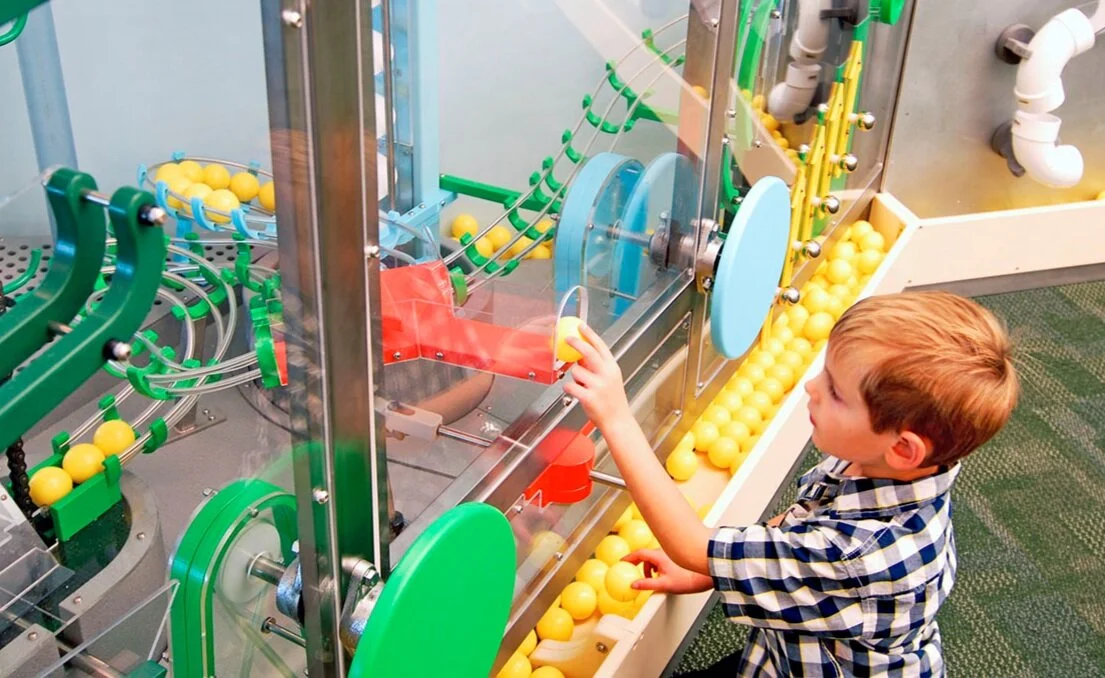 Kids of all ages find enjoyment in watching balls move through the multiple tracks, levers, ramps, and chutes of three different types of ball exhibits. The magnetic walls allow kids and parents to create their own paths.