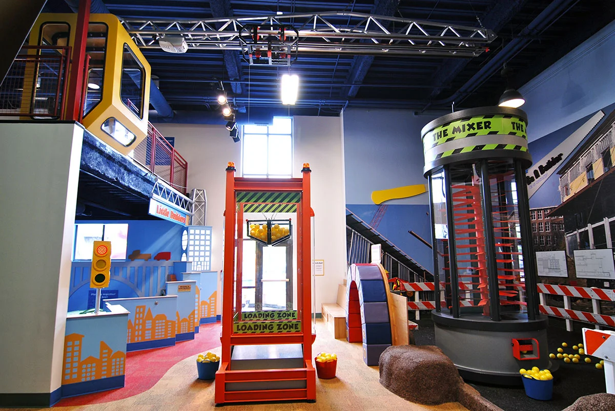 Kids operate the overhead crane so balls can be placed into the crane’s dump bucket. Once the bucket has been loaded the crane operator moves it over the giant mixer and releases the load into the swirling blades of the mixer.