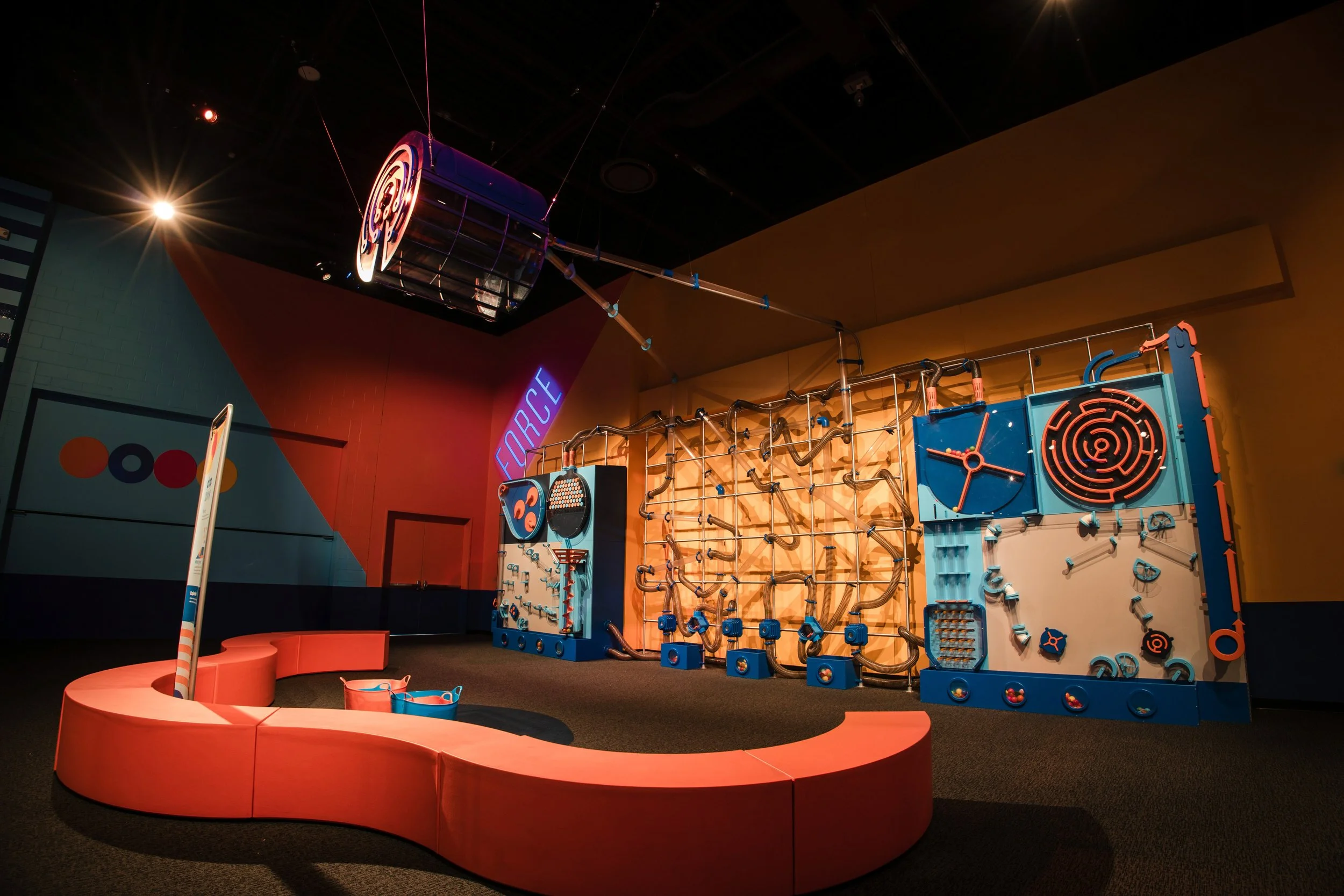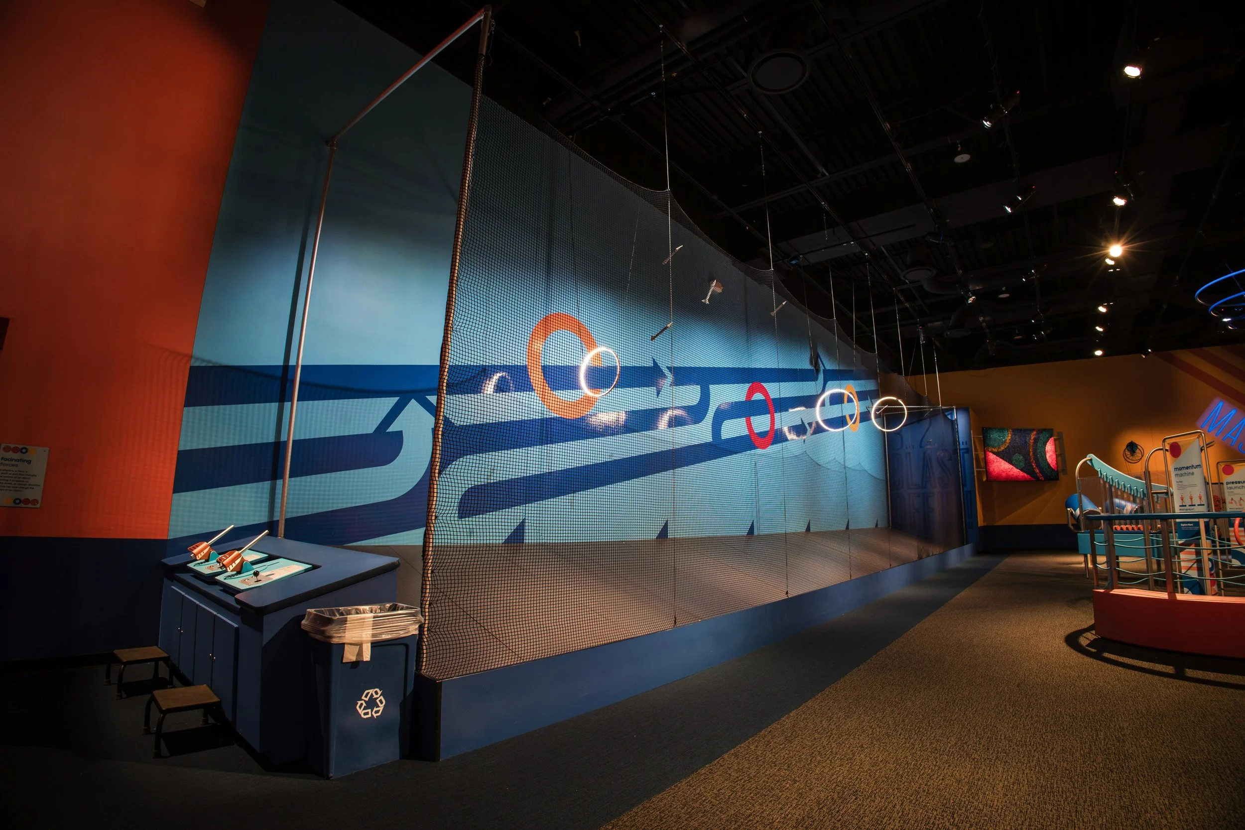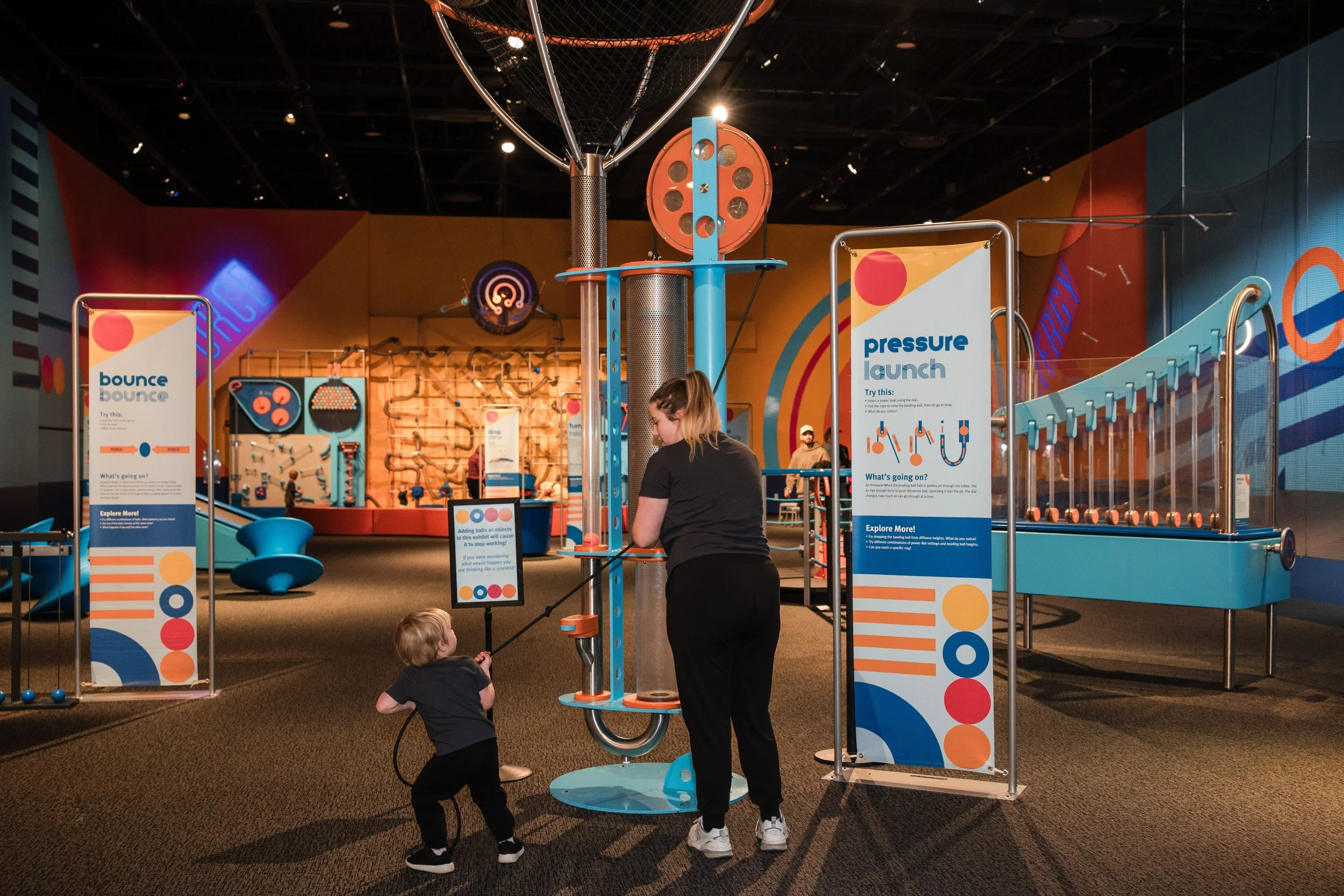 Celebrating the excitement of kinetic energy, the "When Things Get Moving" gallery at the Science Center of Iowa offers a hands-on look at the laws of motion. Boss Display collaborated directly with the science center to design, engineer, and fabricate this suite of interactive exhibits. Anchoring the space is a massive 30-foot ball wall and air tube system featuring a dramatic overhead ball drop, alongside a paper rocket station where guests build and launch their own creations toward targets. Complemented by unique features like a slinky treadmill and Bernoulli blower, the result is a room packed with kinetic motion that invites visitors to experiment with science on a whole new scale.