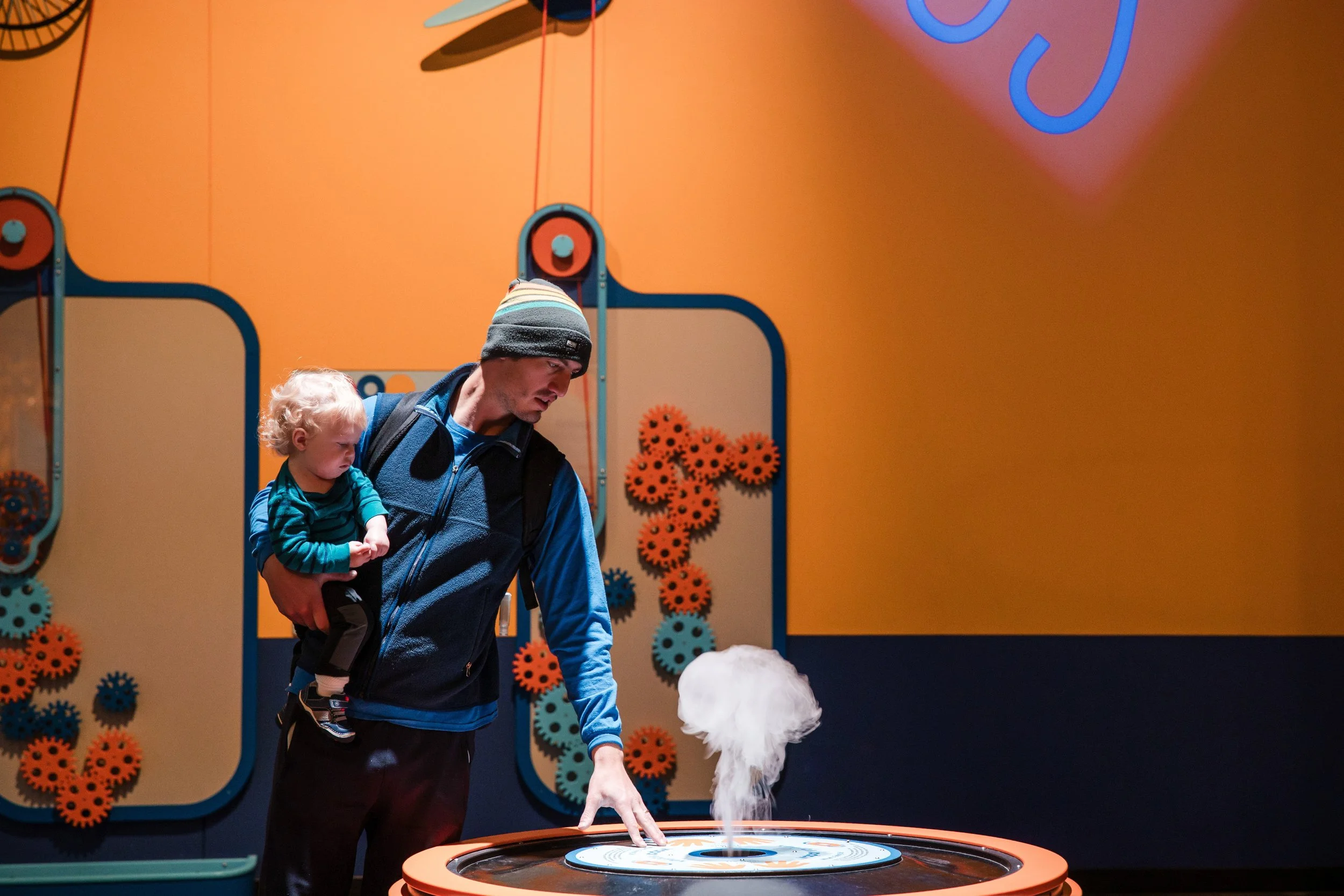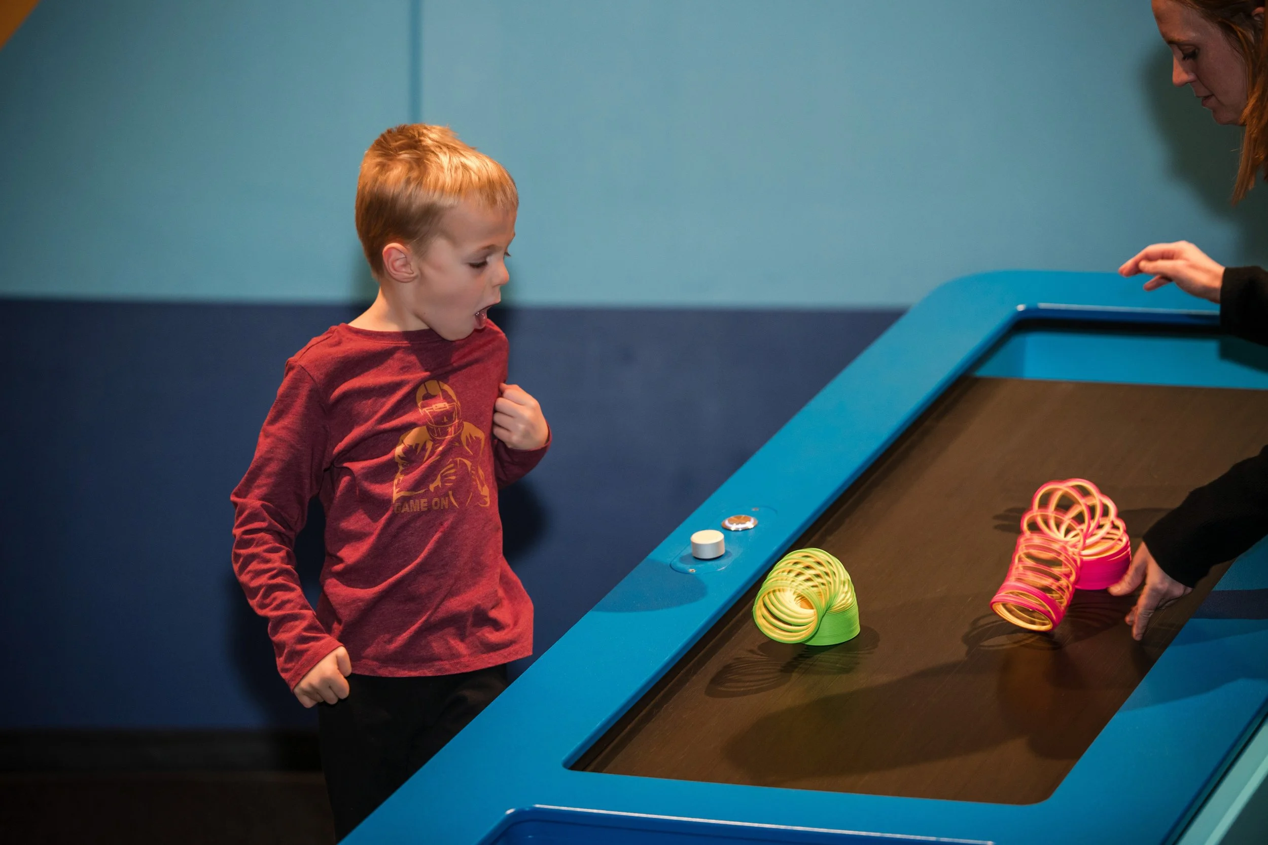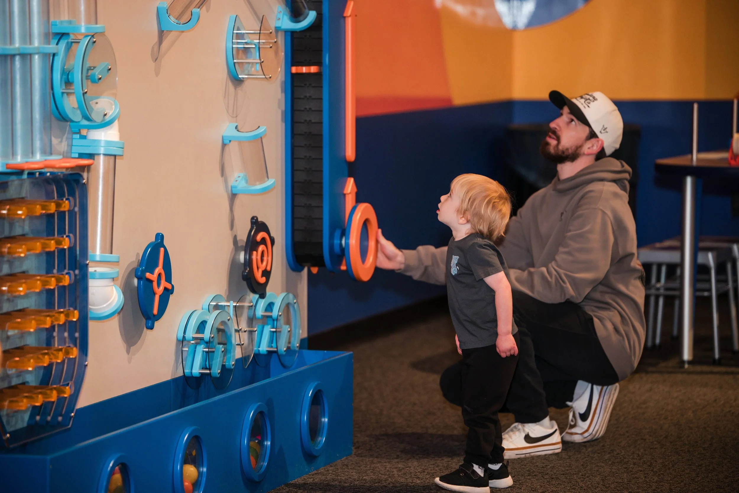 Celebrating the excitement of kinetic energy, the "When Things Get Moving" gallery at the Science Center of Iowa offers a hands-on look at the laws of motion. Boss Display collaborated directly with the science center to design, engineer, and fabricate this suite of interactive exhibits. Anchoring the space is a massive 30-foot ball wall and air tube system featuring a dramatic overhead ball drop, alongside a paper rocket station where guests build and launch their own creations toward targets. Complemented by unique features like a slinky treadmill and Bernoulli blower, the result is a room packed with kinetic motion that invites visitors to experiment with science on a whole new scale.